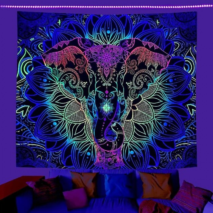 Elephant - UV Reactive Tapestry with Wall Hanging Accessories UK